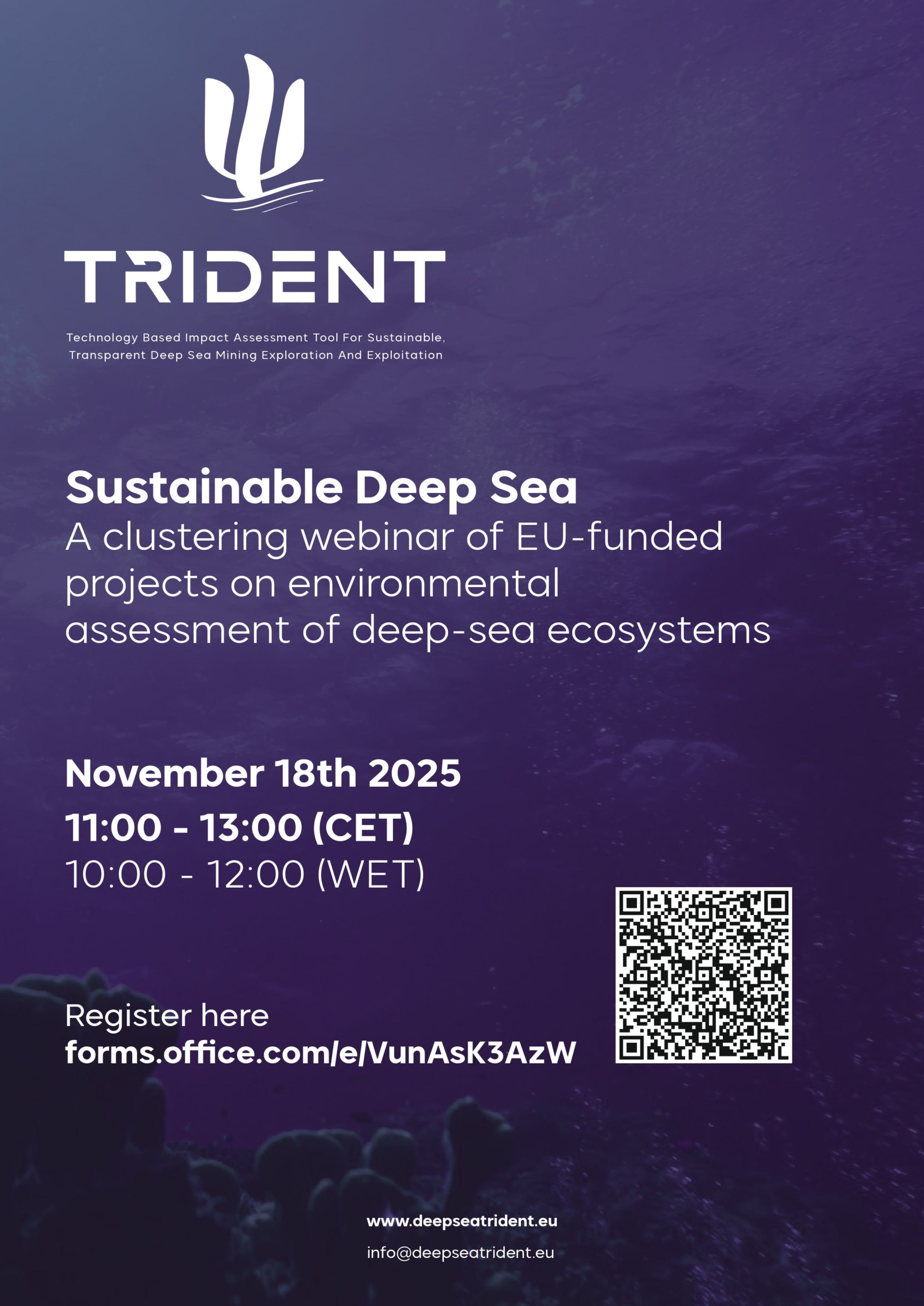 Following the success of the first TRIDENT clustering webinar in April 2024, we are excited to host the second one, taking place in November 18th, 2025 from 11:00 to 13:00 CET (10:00h – 12:00h WET). This session aims to foster collaborative dialogue among projects at the forefront of deep-sea environmental science, providing a platform for knowledge exchange, discussion, and the advancement of sustainable practices in deep-sea research and management.